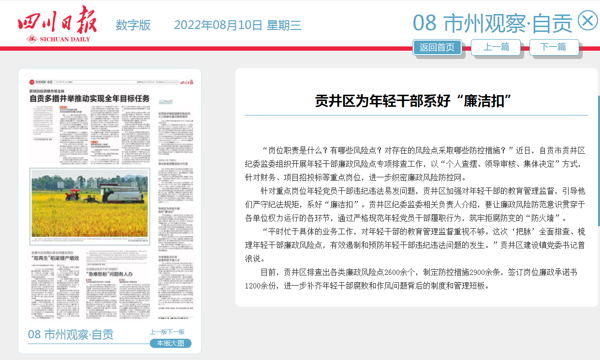 针对重点岗位年轻党员干部违纪违法易发问题,贡井区加强对年轻干部的教育管理监督,引导他们严守纪法规矩,系好“廉洁扣”。贡井区纪委监委相关负责人介绍,要让廉政风险防范意识贯穿于各单位权力运行的各环节,通过严格规范年轻党员干部履职行为,筑牢拒腐防变的“防火墙”。