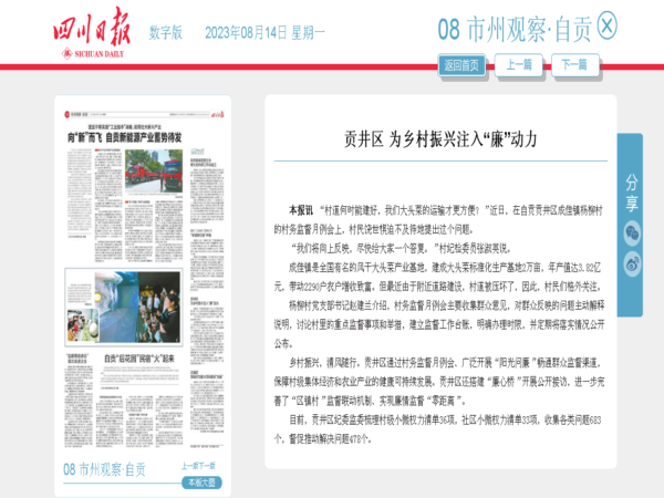 乡村振兴,清风随行。贡井区通过村务监督月例会、广泛开展“阳光问廉”畅通群众监督渠道,保障村级集体经济和农业产业的健康可持续发展。贡井区还搭建“廉心桥”开展公开接访,进一步完善了“区镇村”监督联动机制、实现廉情监督“零距离”。