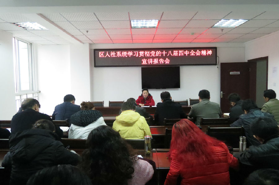 2014年12月16日下午,区人社局党总支召开了十八届四中全会精神宣讲报告会,会议邀请了区委宣讲团领导邓晓艾为区人社系统全体党员干部深入解读十八届四中全会精神,人社系统全体党员参加了会议。