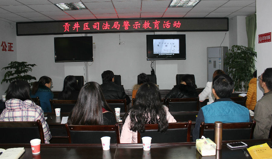 上图为:司法系统干部职工正在观看警示教育片