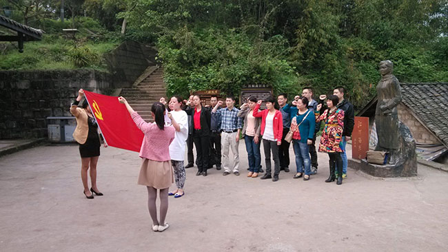 在江姐故居前,镇机关党员面对鲜红的党旗举起右拳,一字一句重温入党誓词,表达了对党的无限忠诚和热爱,进一步坚定了中国特色社会主义信念。