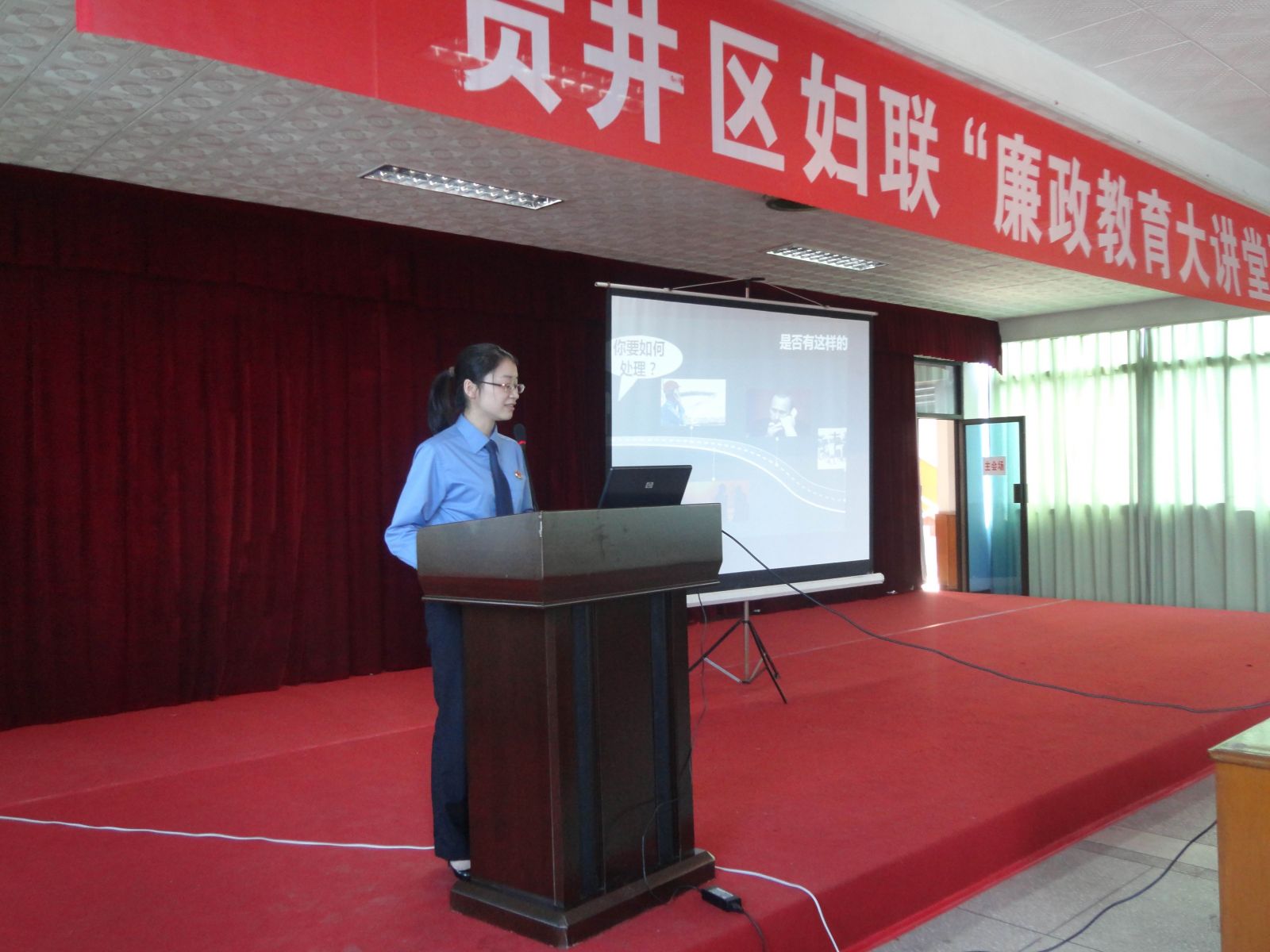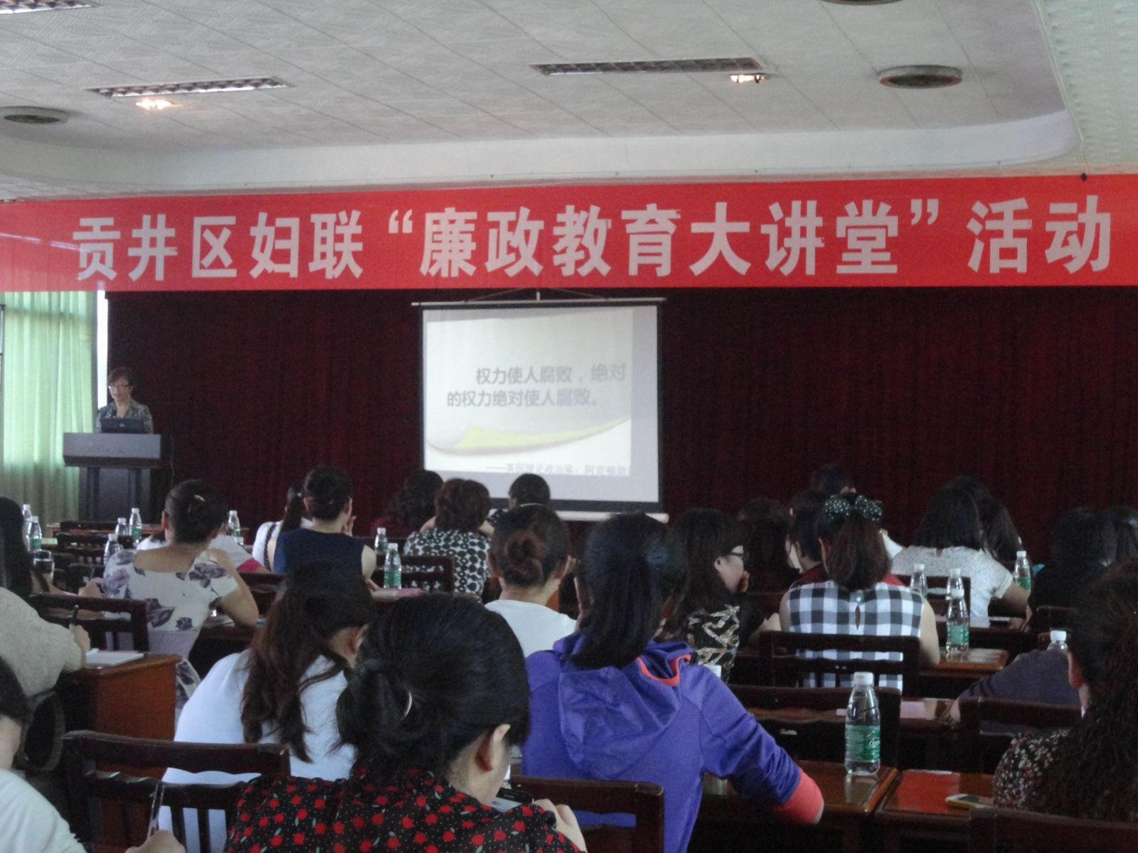 9月,贡井区妇联邀请自贡市人民检察院预防职务犯罪宣讲团成员甘露梅、文静两名检察官在区政府会务中心,举行了“廉政教育大讲堂”活动,各乡镇街道妇联主席、区级部门(系统)妇女委会主任,区女领导干部联谊会全体会员近150人聆听了讲座并发放了家庭助廉宣传单300余份。