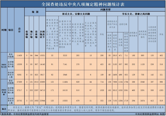 3月29日,中央纪委国家监委公布了2025年2月全国查处违反中央八项规定精神问题汇总情况。当月,全国共查处违反中央八项规定精神问题11459起,批评教育和处理15209人,其中党纪政务处分9292人,这是连续第138个月公布月报数据。