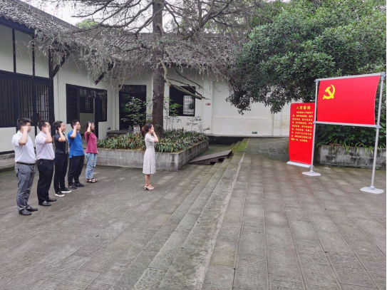 在吴玉章生平事迹陈列馆、吴玉章故居,全体党员干部职工在解说人员的带领下,共同回顾了吴玉章波澜壮阔的一生,深刻的感受到了老一辈革命先驱的不朽精神。在革命先烈吴玉章雕像前,面对鲜红的党旗,全体党员高举右手,集体重温入党誓词,回忆入党初心,思考如何践行入党誓言。