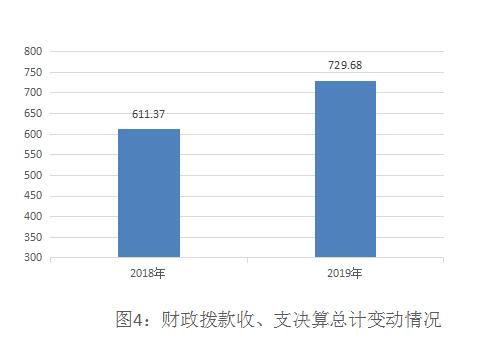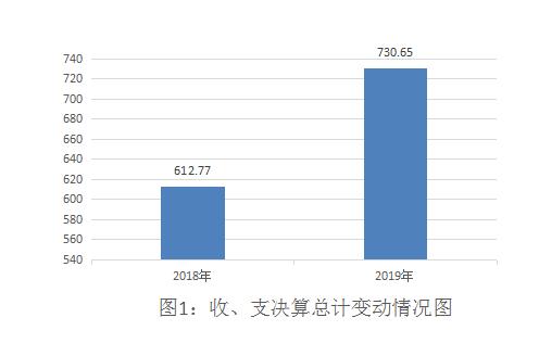 2019年度收、支总计730.65万元,其中年初结转和结余0.97万元。与2018年相比,收、支总计各增加117.88万元,增长19.24%。主要变动原因是监督执纪、审查调查工作任务加重,经费支出增加。