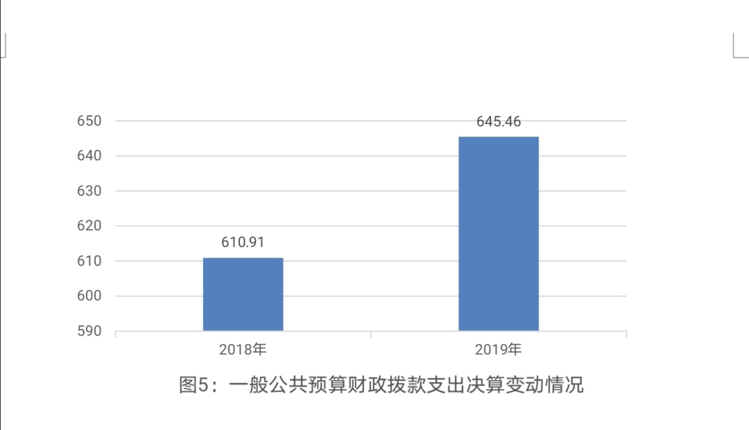 2019年一般公共预算财政拨款支出645.46万元,占本年支出合计的100%。与2018年相比,一般公共预算财政拨款增加34.55万元,增加5.66%。主要变动原因是监督执纪、审查调查工作任务加重,经费支出增加。