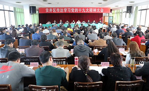 黄劲在讲话中指出,党的十九大,是在全面建成小康社会决胜阶段、中国特色社会主义进入新时代的关键时期召开的一次十分重要的大会。习近平总书记所作的报告,描绘了决胜全面建成小康社会、夺取新时代中国特色社会主义伟大胜利的宏伟蓝图,进一步指明了党和国家事业的前进方向,是我们党团结带领全国各族人民在新时代坚持和发展中国特色社会主义的政治宣言和行动纲领,是马克思主义的纲领性文献。全区各级党组织和广大党员干部要充分认识党的十九大胜利召开的重大历史和现实意义,全面领会、深入贯彻落实大会精神,坚定以习近平新时代中国特色社会主义思想统揽贡井工作,奋力拼抢机遇、追赶跨越,为加快建设“产业强区、品质西城”而努力奋斗。