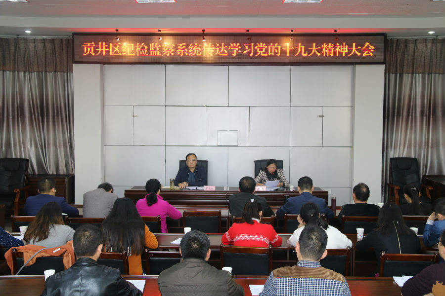 11月3日下午,贡井区纪委召开全区纪检监察系统传达学习党的十九大精神大会,区纪委副书记洪霞主持会议,并领学了十九大主要精神,传达了省、市、区学习传达会议主要精神,动员全区纪检监察干部学习好,宣传好,贯彻好党的十九大精神。