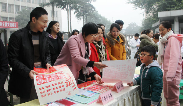 手拉手围成圈的人类和动物寓意“平等”、现代化的城市象征着“富强”……这是贡井区创新制作的“24字”社会主义核心价值观剪纸作品,每一张剪纸都是一幅画,每一幅画里都讲述着一个小故事。活动当天,这套剪纸作品以年历画的形式再次“亮相”并免费发放,深受广大群众的称赞。