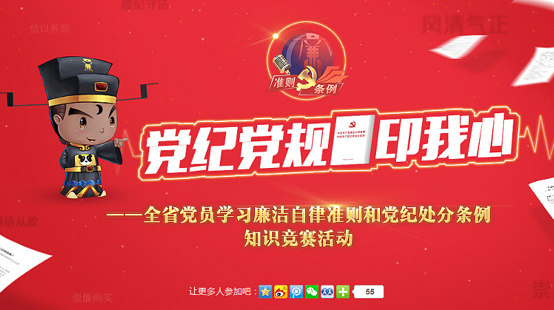 新修订的《中国共产党廉洁自律准则》(以下简称《准则》)和《中国共产党纪律处分条例》(以下简称《条例》),将于2016年1月1日实施。为推动《准则》《条例》的学习宣传贯彻,按照省委总体部署,省纪委、省委组织部、省委宣传部在全省组织开展党员学习《准则》《条例》知识竞赛活动。日前,四川省纪委网站“廉洁四川”已推出“党纪党规印我心——全省党员学习廉洁自律准则和党纪处分条例知识竞赛活动”专栏,欢迎广大党员干部进入专栏进行在线答题闯关! (点击上图进入链接)