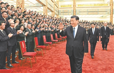上午10时30分,习近平等来到人民大会堂金色大厅,全场响起长时间的热烈掌声。习近平等向代表们挥手致意,同大家亲切交流并合影留念。